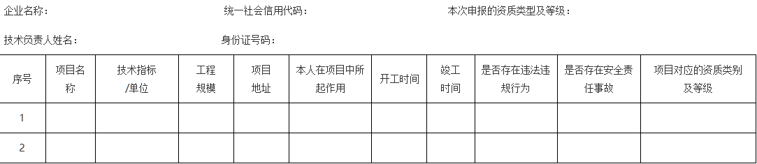 注:业绩基本信息表请上传excel格式文件;个人业绩佐证材料需合并成一个PDF文件,以固定格式命名,如xx有限公司申报xx施工总(专业)承包二级资质业绩及设备材料。