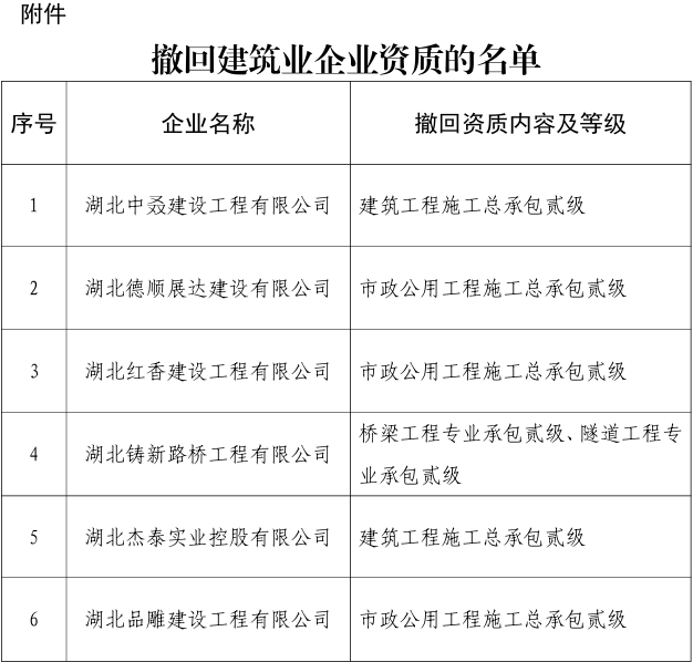 经调查核实,湖北中叒建设工程有限公司等6家企业现已不再符合相应建筑业企业资质标准要求条件。我厅依法作出《湖北省住房和城乡建设厅撤回行政许可意见告知书》,相关单位签收后提出书面申辩,经研究,决定不予采纳该申辩意见。依据《建筑业企业资质管理规定》(住房城乡建设部令第22号)第二十八条规定,我厅决定依法撤回湖北中叒建设工程有限公司等6家建筑业企业相关资质的行政许可(详见附件)。